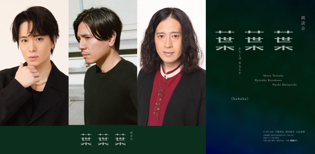 吉田和睦 朗読会「葉葉葉」-わたしはあなたか吉田和睦 作・演出・出演:戸塚祥太(A.B.C-Z)、黒川隆介、又吉直樹 10月29日(水)〜10月31日(金) 会場:キリスト品川教会 グローリア・チャペル 協力プロデューサー:吉田和睦